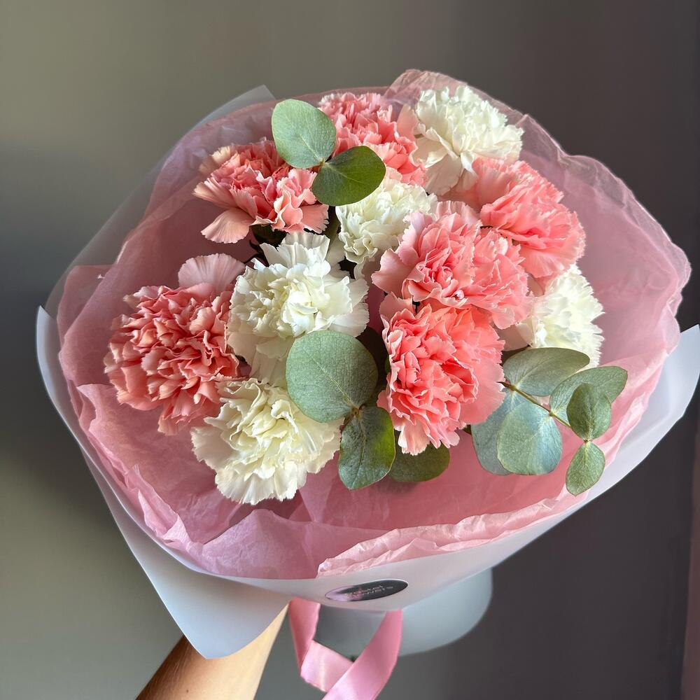 Стойкий и нежный букет из гвоздик с эвкалиптом.